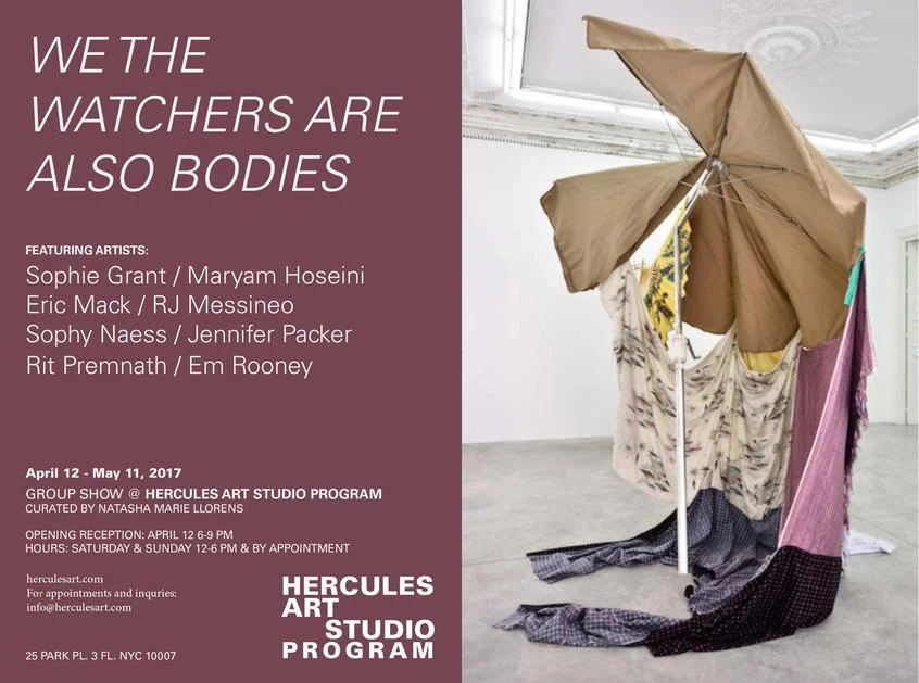 "We The Watchers Are Also Bodies", April 12 - May 11, 2017.  Include works by Hercules Artist Sophie Grant, and guest artists: Maryam Hoseini, Eric Mack, RJ Messineo, Sophy Naess, Jennifer Packer, Rit Premnath, and Em Rooney. Curated by Natasha Marie Llorens.
